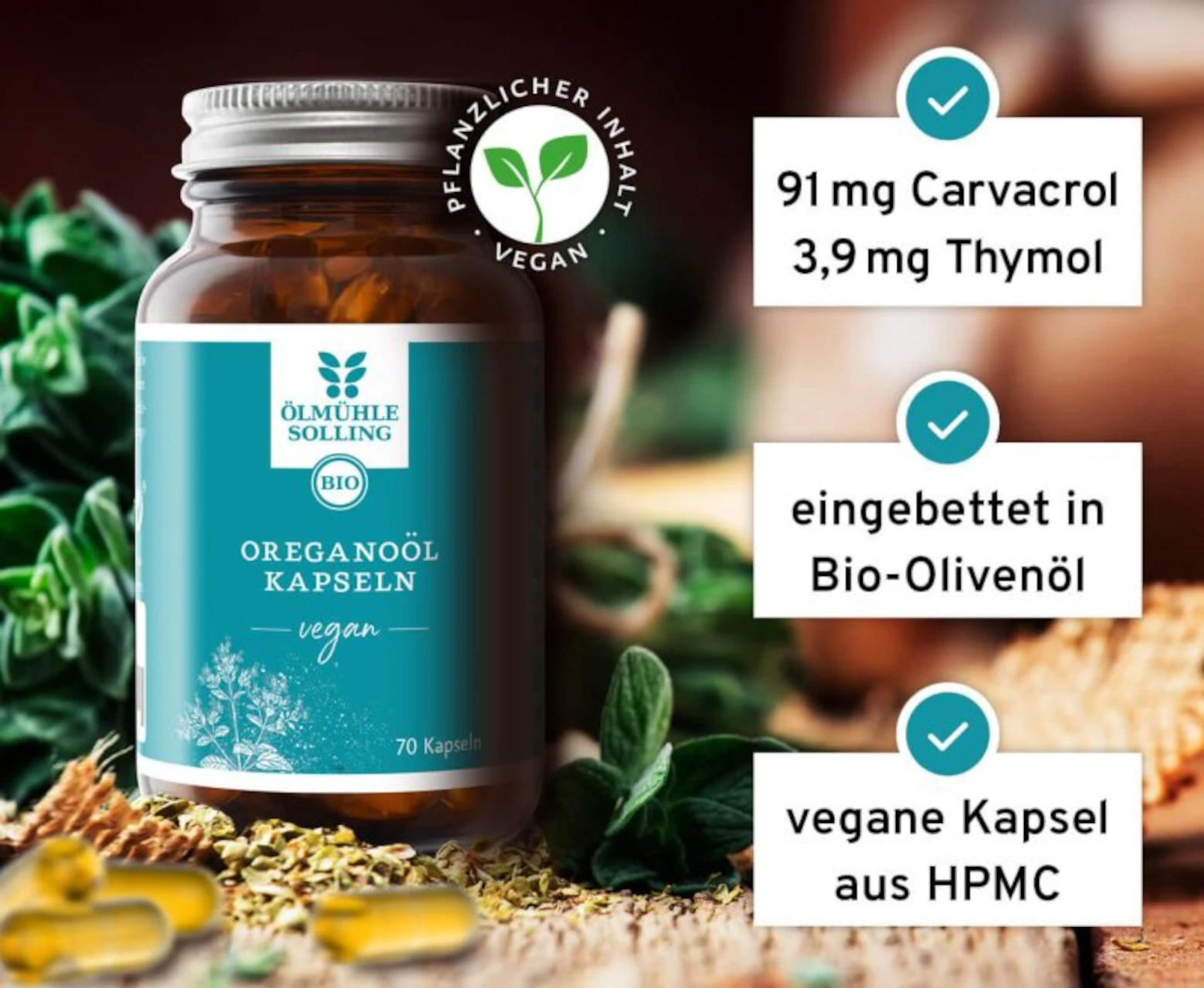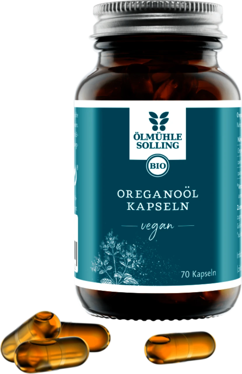 Die veganen Oreganoöl-Kapseln der Ölmühle Solling enthalten die wertvollen Pflanzenstoffe Carvacrol und Thymol.